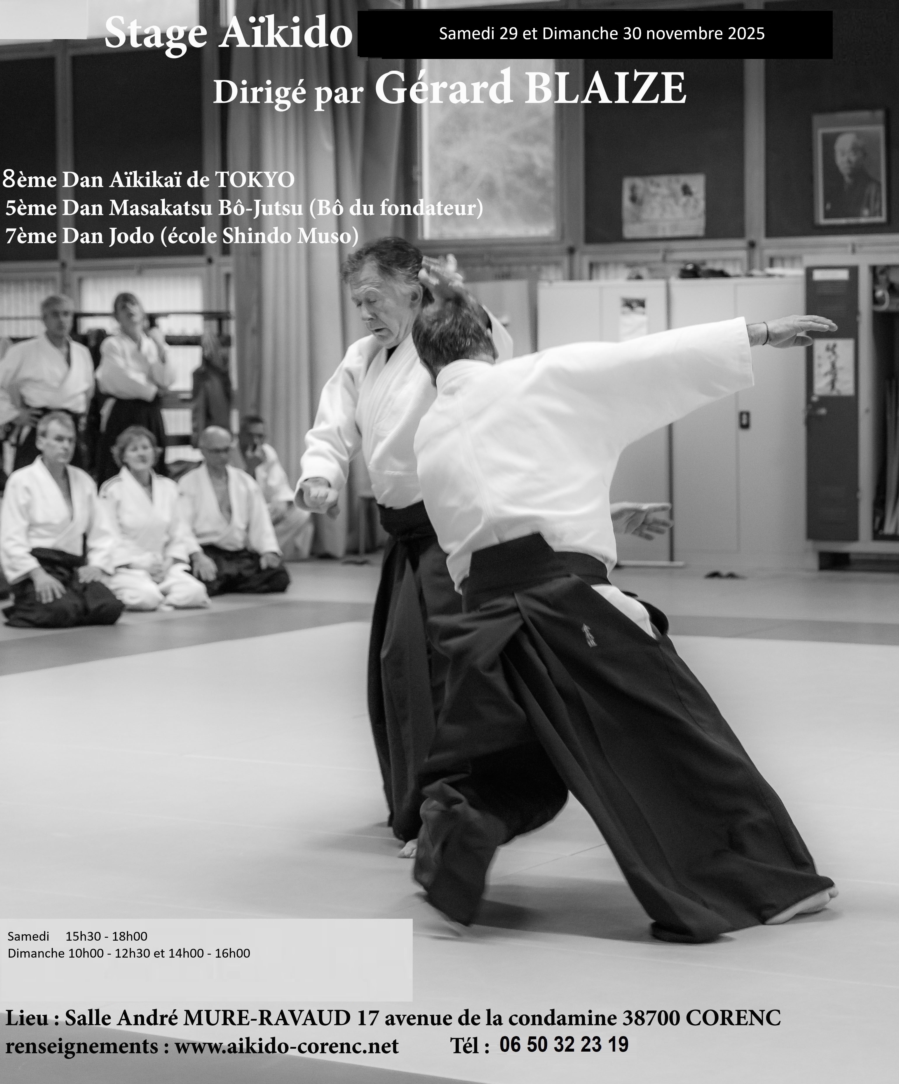 Important, le stage dirigé par Gérard Blaize, 8ème Dan de l'Aïkikai de Tokyo, se déroulera dans notre dojo les 29 et 30 novembre 2025.